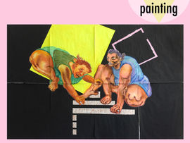 I draw the same size of a portion of the river. On the left side of the painting, I use artificial materials such as pastel and acrylic, and on the right side of the painting, I use natural materials such as flower juice, mud after rain, and burnt charcoal.